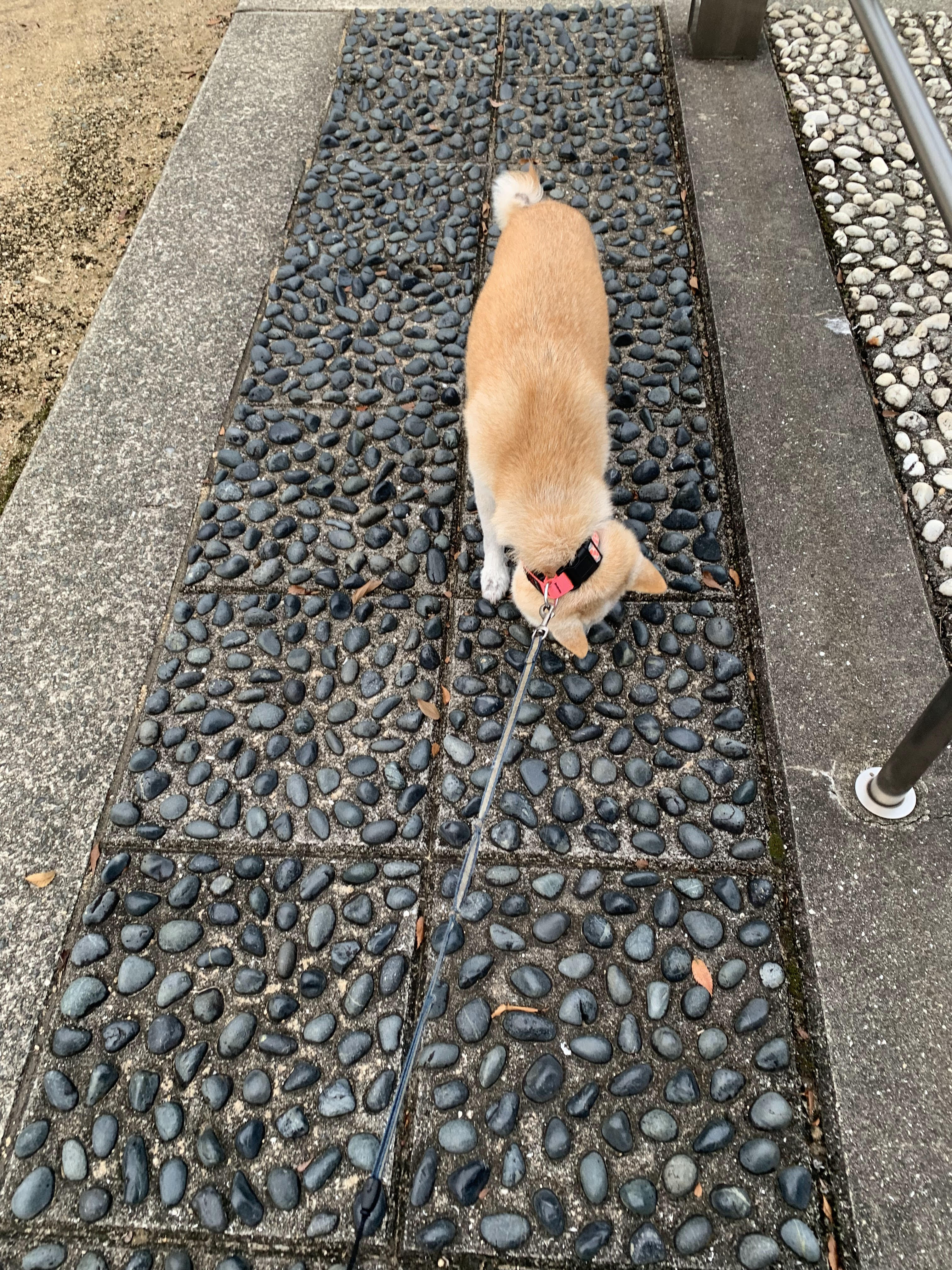 ふと振り向くと、愛犬も足つぼロードを歩いていました。