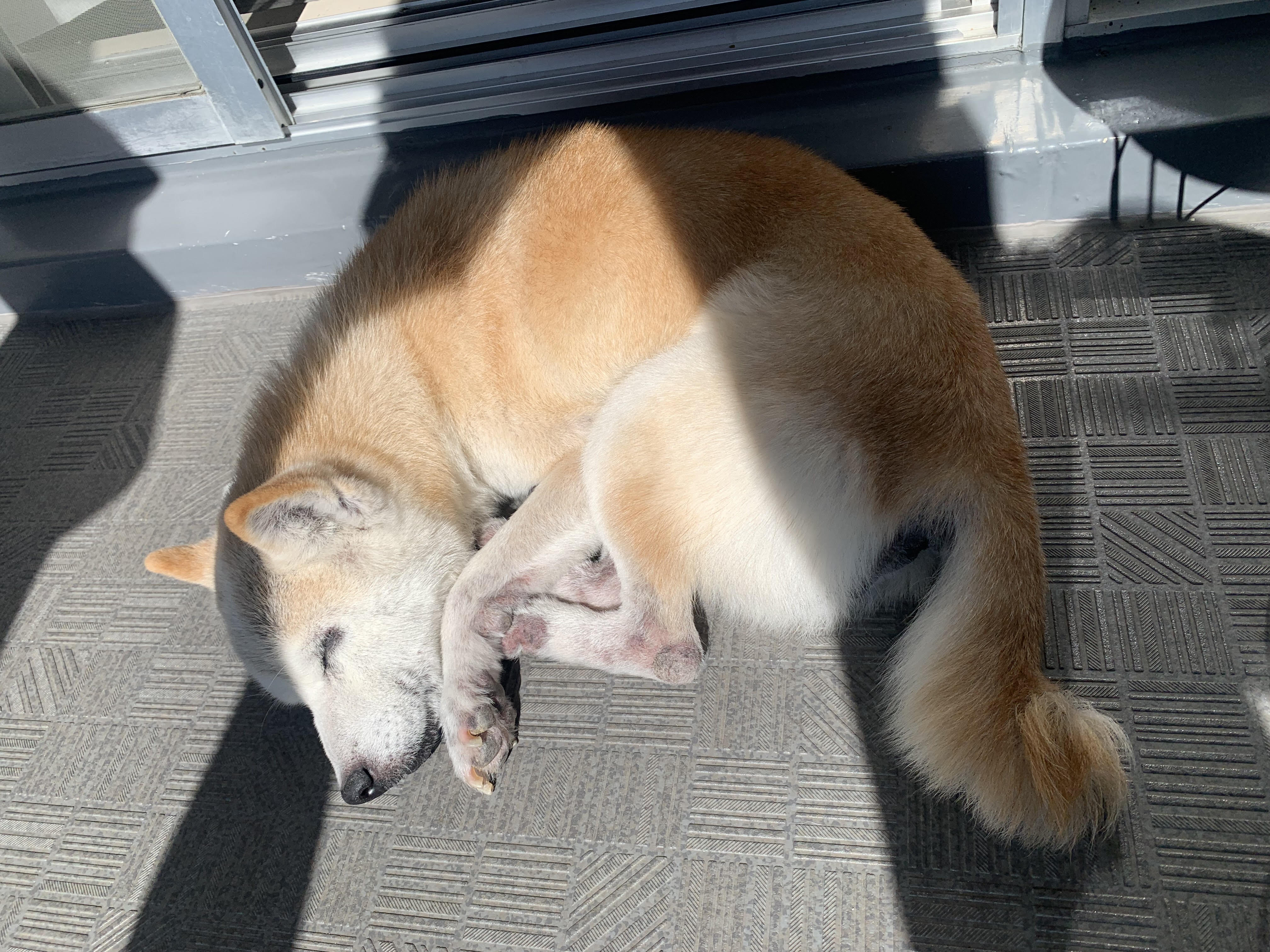 洗いあがった部品をせっせとベランダに運んでいる隙に、ちょうどベランダの出入り口付近を陣取り、しれっと日向ぼっこを始める15歳の愛犬…。